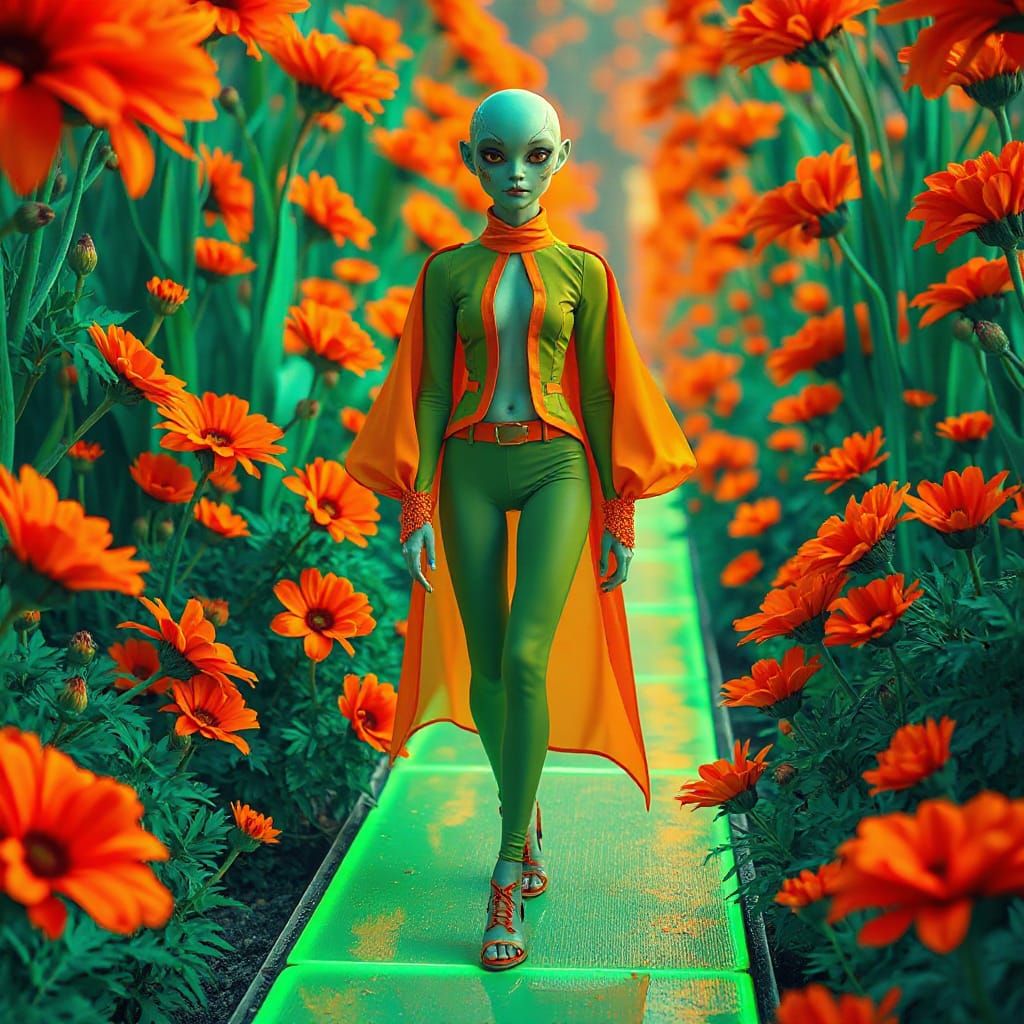 A striking picture of an alien fashionista in neon couture walking a glowing path. The image is 3D rendered digital art with abstract elements and complementary colors.