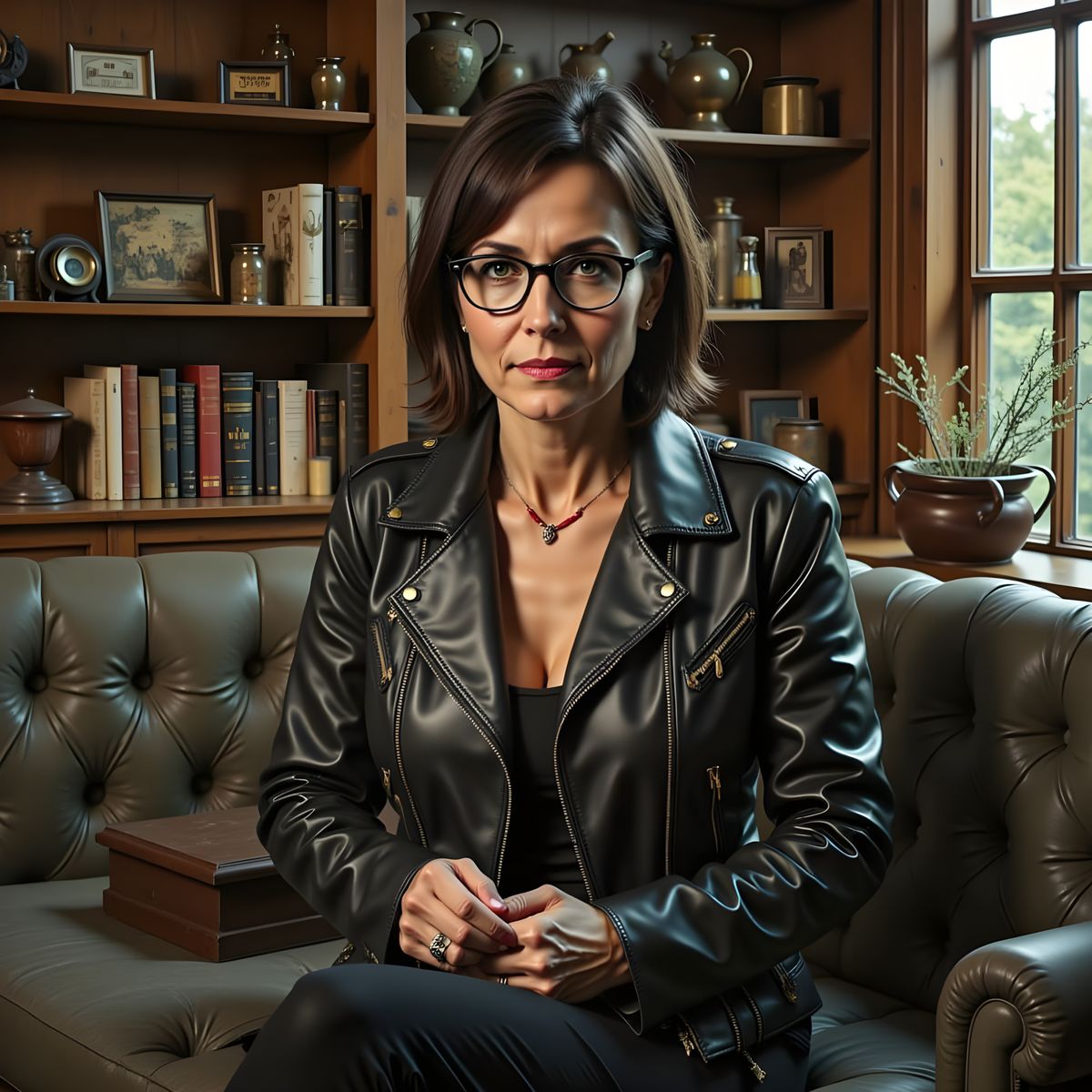 This image exudes confidence and sophistication. The woman’s stylish leather jacket and thoughtful expression suggest strength and intelligence, perfectly complemented by the cozy, book-filled background. A truly inspiring portrait!