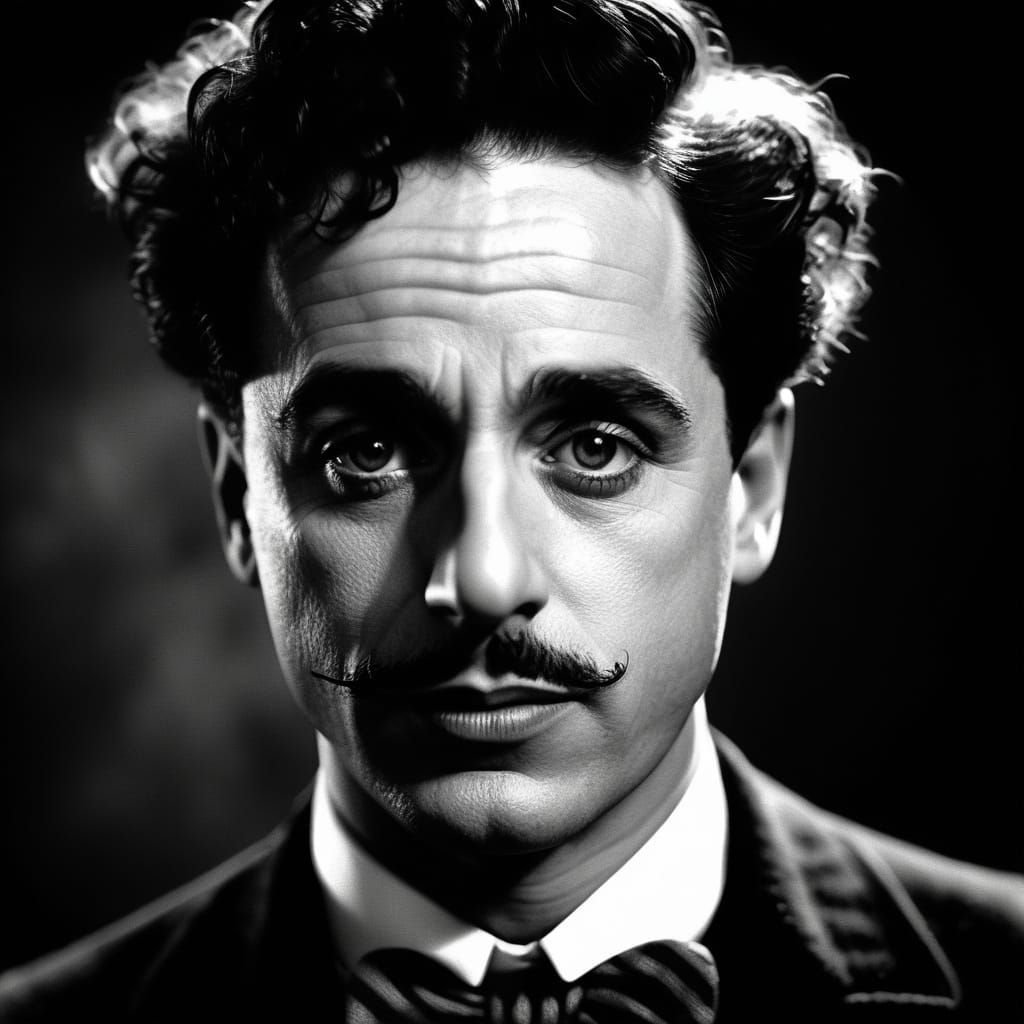 This duotone image shows a close-up portrait of Charlie Chaplin in soft focus. The high-contrast black and white shot is reminiscent of vintage cinematic photography with film grain.