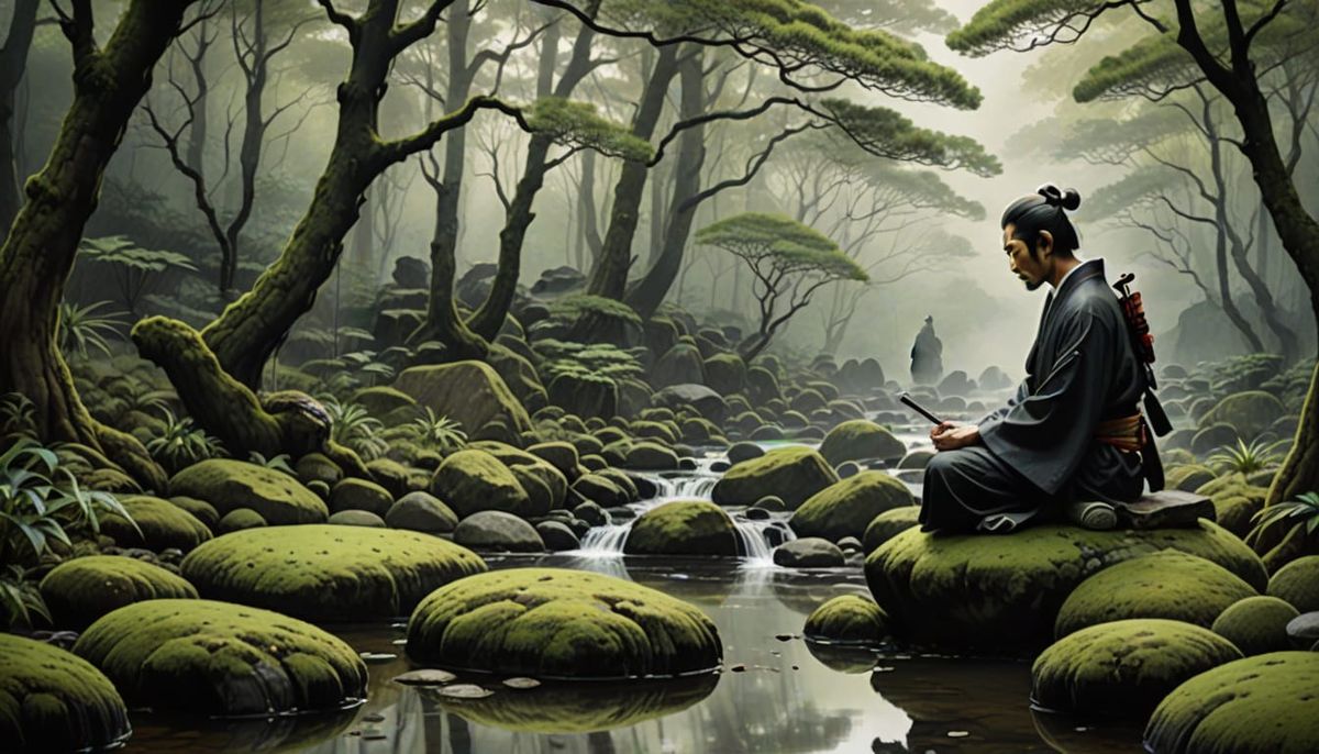 This image shows a lone samurai in deep meditation near a stream. The artwork employs traditional East Asian ink wash techniques with soft, serene colors and dappled light to create a dreamlike, contemplative atmosphere.