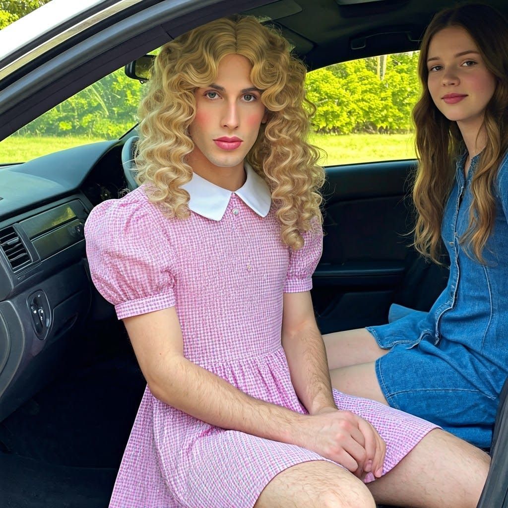 This image features a slender 19-year-old with delicate features, crossdressing in a pink and white plaid Peter Pan dress. Photographed with a professional, high-fashion aesthetic, natural light, and bokeh effects.