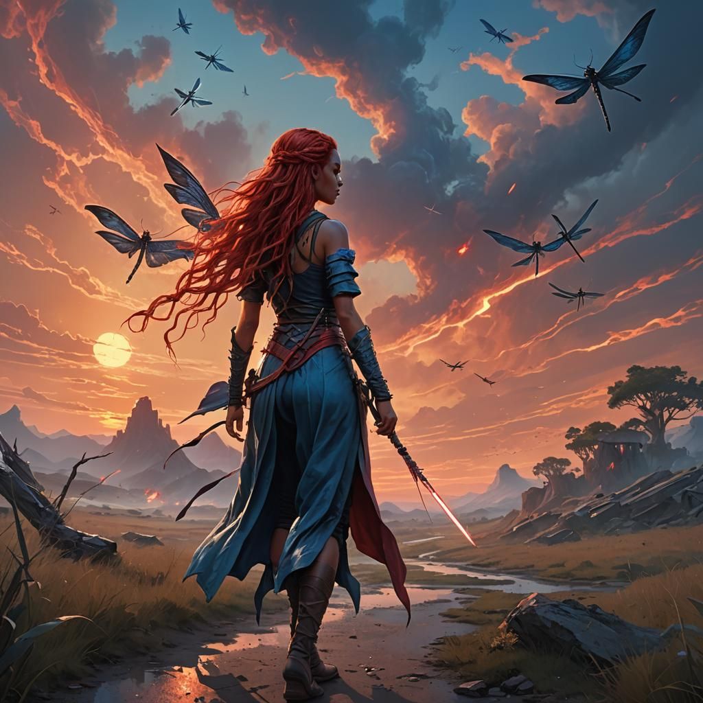 A young woman with wavy red braids, wearing a revealing blue sorcerer's outfit with slits up the sides that show lots of skin, back turned, walks proudly away into a distant scarlet sunset across a battlefield. A blue ethereal glow encircles her as she walks along. The scene is ethereal and magical. ...