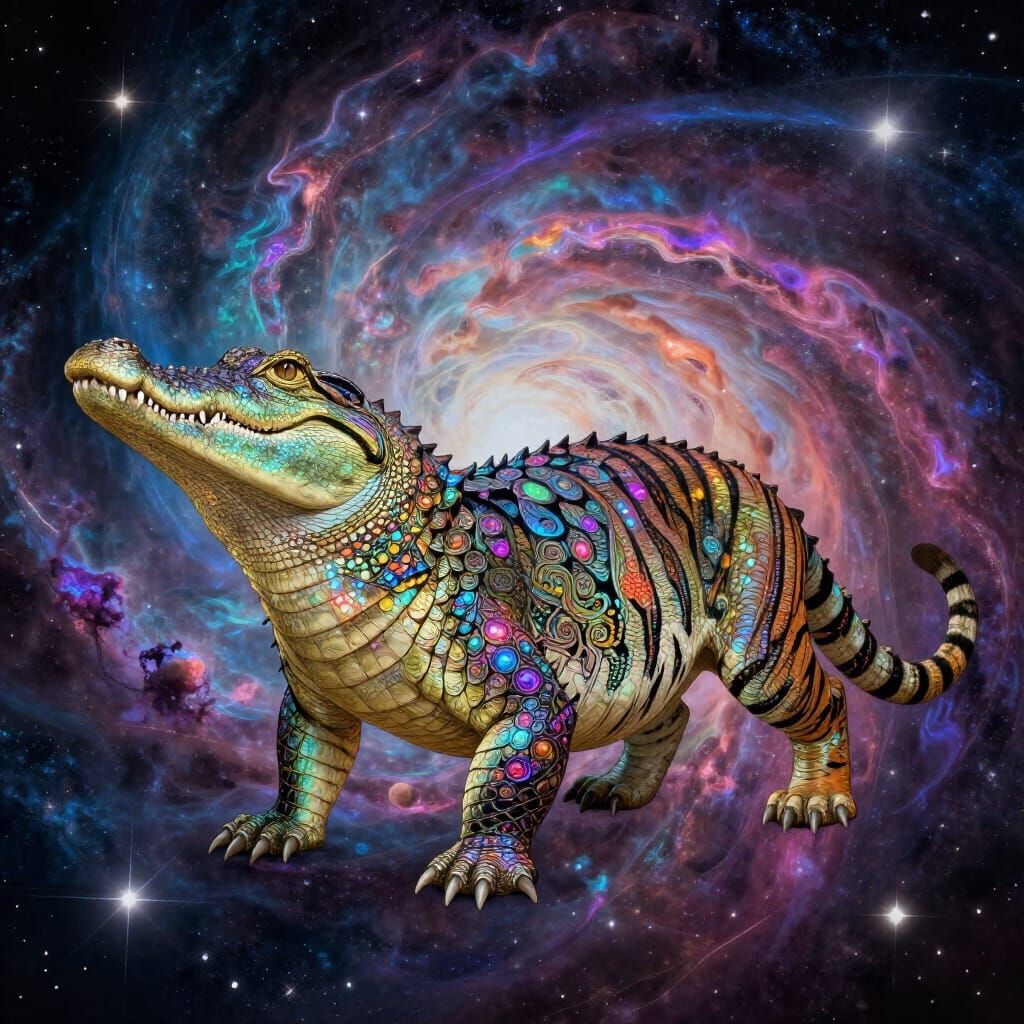 This image shows a hybrid creature blending crocodile and tiger features, set against a swirling cosmic background. It features intricate patterns, iridescent scales, and fur with psychedelic colors in a mixed media style.