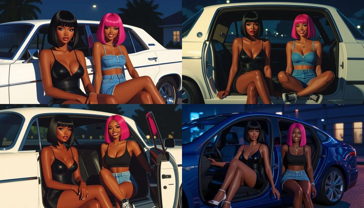 This AI-generated image shows a young African woman with straight black hair and a black dress, appearing fearful inside a car. The scene also features another woman with pink hair and a blue skirt, smiling at night. It displays 3D shading and depth.