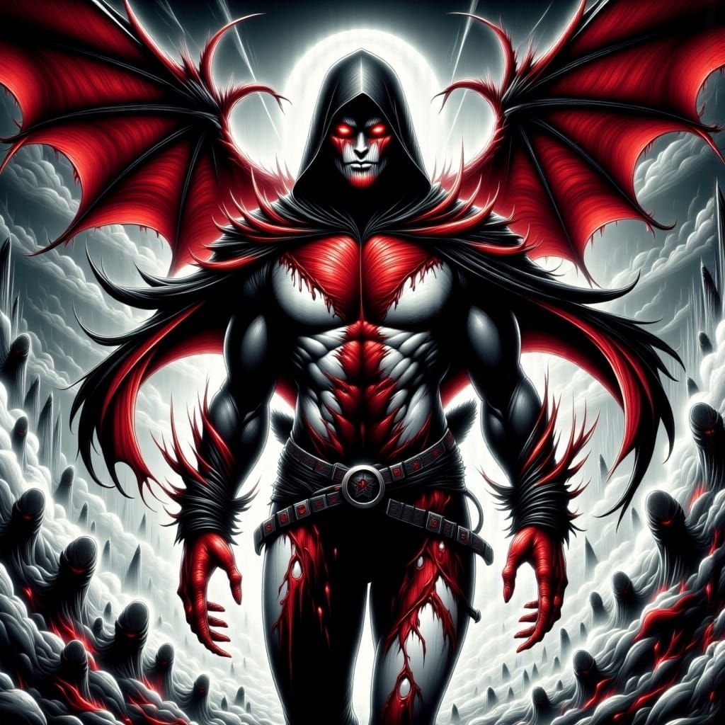 Nyarlathotep, the malevolent, otherworldly Primordial King of the Abyss, masquerading as Omniman, clad in a tattered, ominous red and white hero suit with black accents, besmirched by dark, crimson blood splatters, with an air of maleficence and dark, eldritch energy, inspired by the dark fantasy and horror elements of H.R. Giger, the eerie, atmospheric landscapes of Zdzisław Beksiński, and the dark, gothic, superhero aesthetic of Jae Lee.