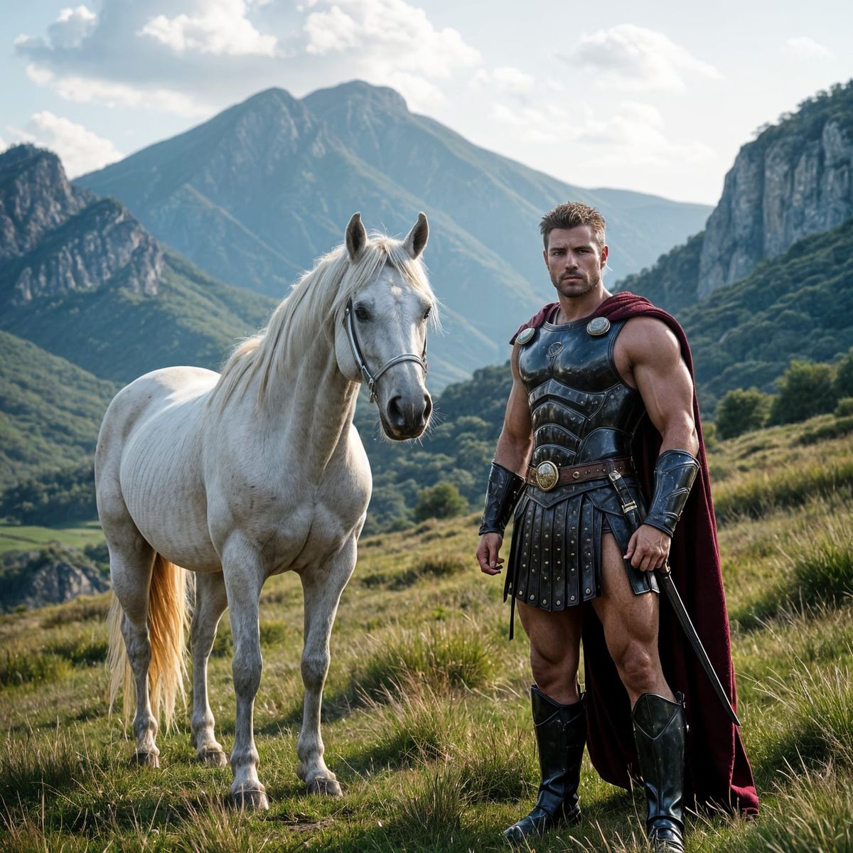 This image shows a pale horse with blue eyes beside a warrior in black leather armor, standing in a grassy caldera surrounded by mountains. The image has a cinematic, film-like aesthetic.