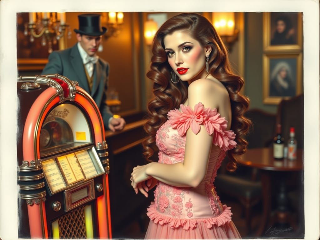 This image shows a beautiful woman in a pink dress, reminiscent of a 1920s magazine cover. The artwork features dulled colors, evoking a vintage, polaroid style.