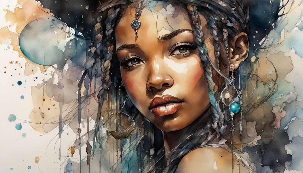 This image shows a beautiful Black woman with long cornrows and a black gown with silver embossing, bathed in moonlight. Rendered in a vibrant watercolor and ink chibi style with volumetric lighting.