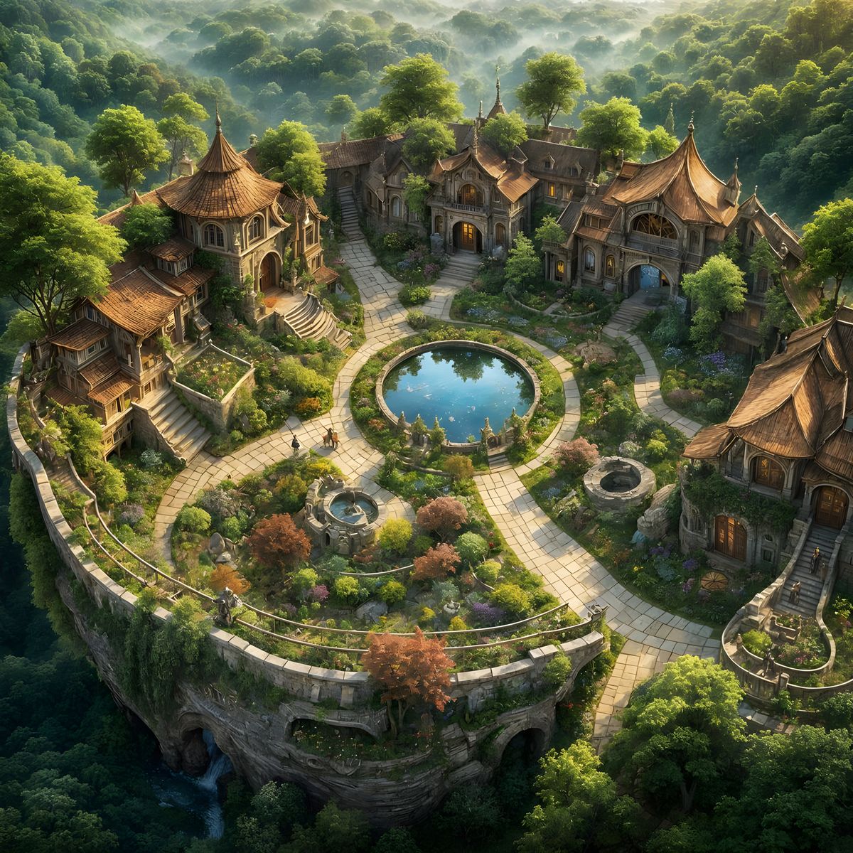 "top-view perspective extremely detailed complex landscape (layout of a permaculture garden) high fantasy, Magical, Hyperdetailed Epic Masterpiece; Complex, Royo, Rutkowski, Greg Olsen; Bagshaw, Chevrier, Ferri, Kaluta, Victor Adame Minguez, Diego Gisbert Llorens, Mucha, WLOP, Anato Finnstark, HDR""