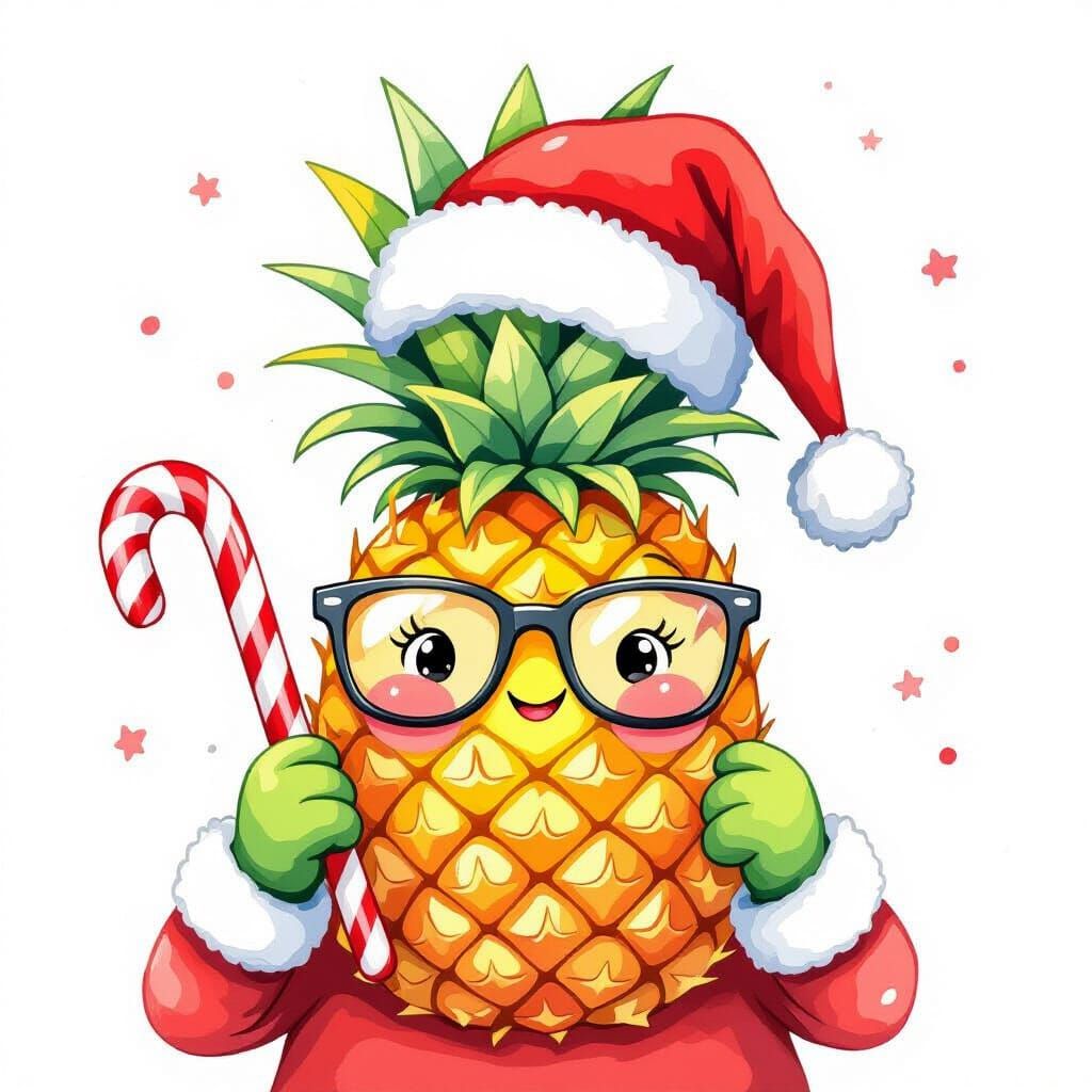 This image shows a whimsical watercolor of a pineapple wearing glasses and a Santa hat, cheerfully holding a candy cane against a white backdrop. The illustration is rendered in a playful style.