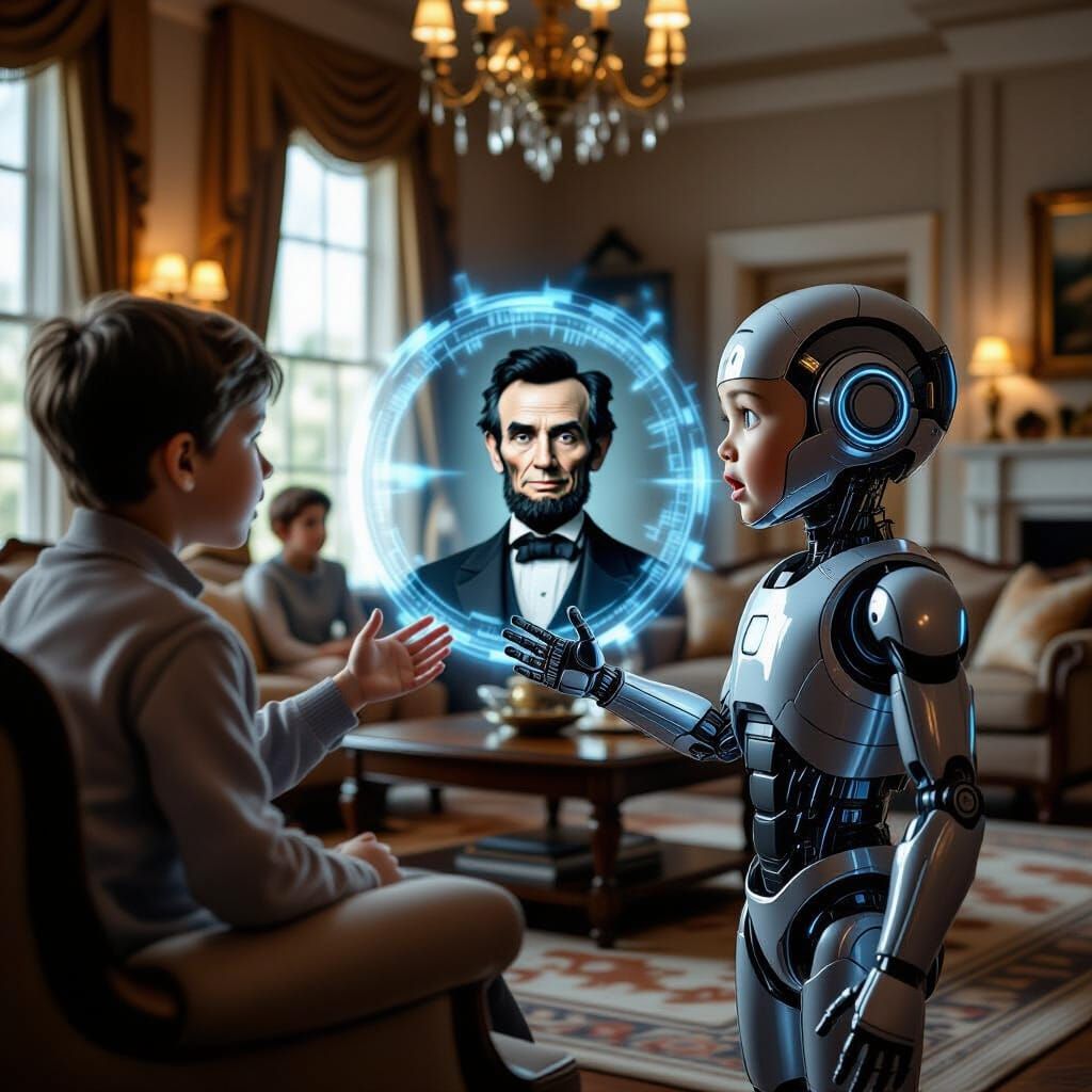 Photo-realistic. Android child with human face argues with human parents that Abe Lincoln is alive and uses technology portal into an alternate reality to produce a surprised president. Background is a well furnished living room in mansion. Use meticulous attention to detail and texture .