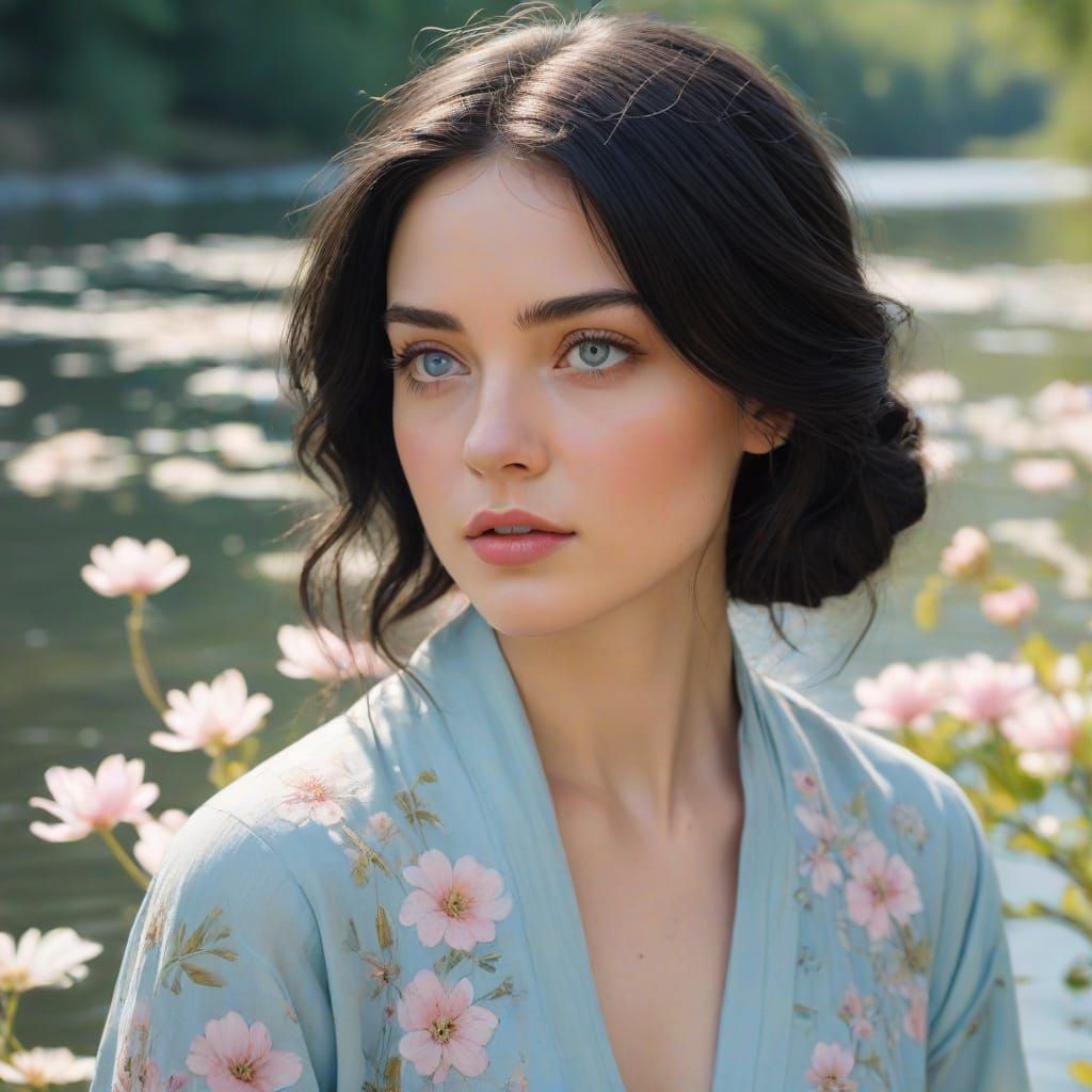 A tranquil impressionist painting of a dark-haired woman looking sideways. She wears light blue and is adorned with white flowers. The artwork captures a serene atmosphere with soft brushstrokes and colors.