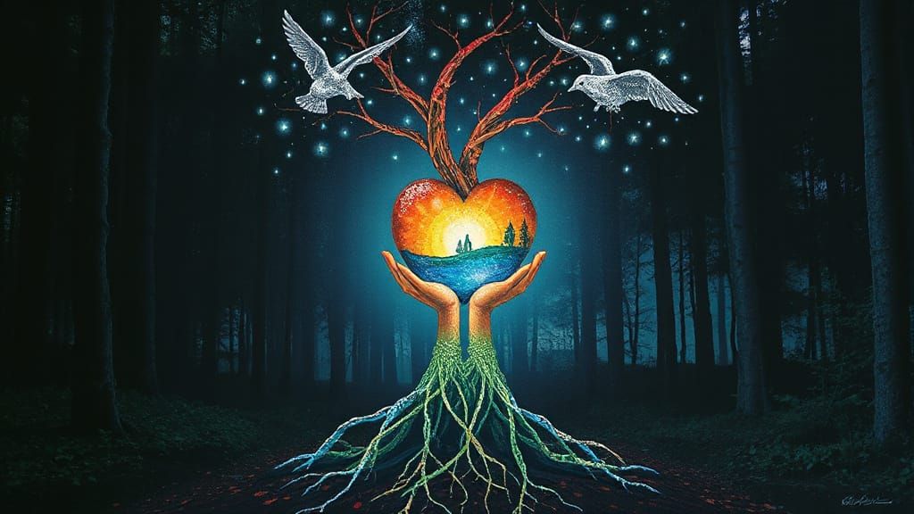 This image shows a radiant being emerging from a forest floor, depicted as a blossoming tree with roots and branches. It features bioluminescent skin, silver filigree, and symbolizes empathy and shared joy.