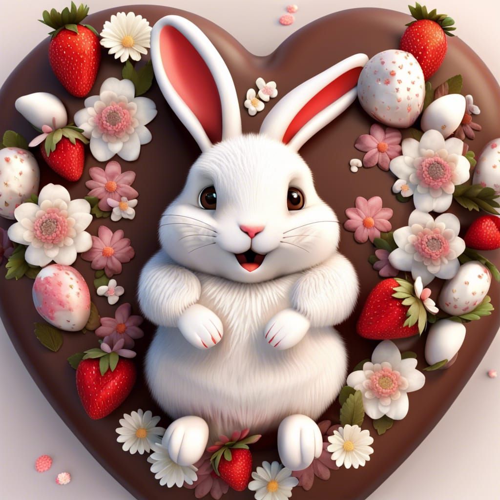 This image shows a fluffy white bunny perched on a large chocolate heart adorned with chocolate flowers and strawberries. It is a highly detailed, photorealistic digital rendering.