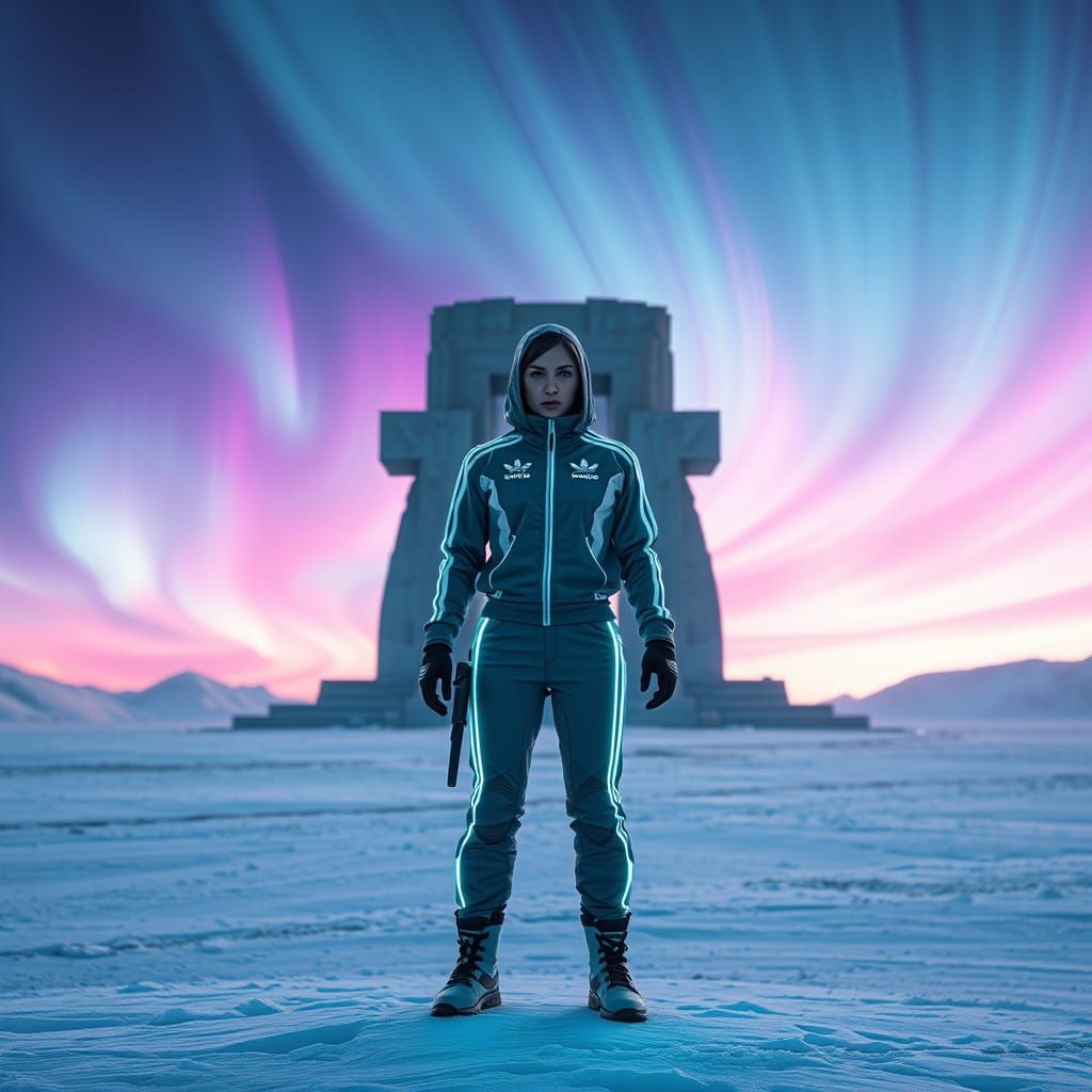 This image shows a futuristic Slavic warrior queen guarding an ancient monolith. The scene blends cyberpunk with Slavic folklore in a desolate, snow-covered wasteland under an aurora, in a Beksiński-esque style.