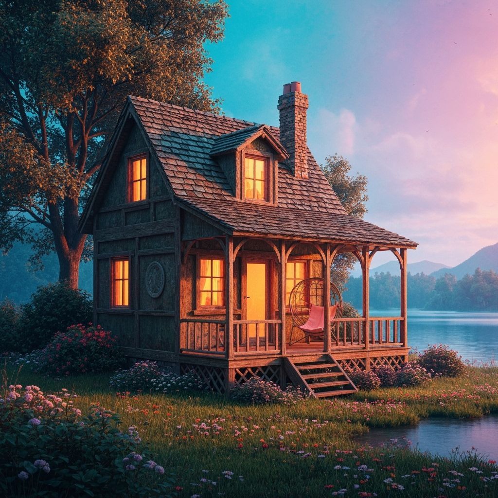 This image shows a romantic cottage bathed in a warm glow, nestled by a serene lake surrounded by a lush forest. The hyperrealistic image evokes happiness with rich textures and dramatic lighting in a splash art style.