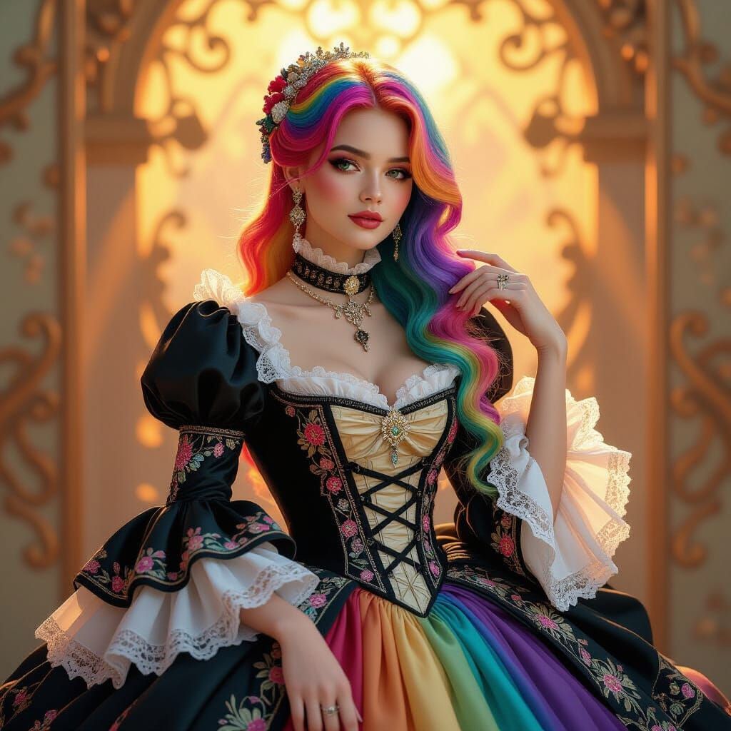 A digital rendering of a woman with rainbow hair in a Victorian gown. The image combines surreal dreamscapes with bold pop-art colors, set against soft golden lighting and baroque patterns.
