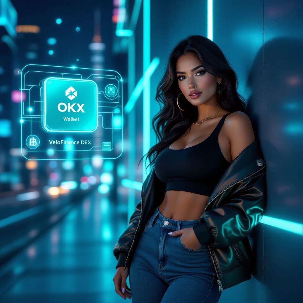 This image shows a confident Latina woman in a futuristic cityscape. The scene features neon lights and holograms displaying financial technology, rendered with soft turquoise and chrome blue tones, accented with gold.
