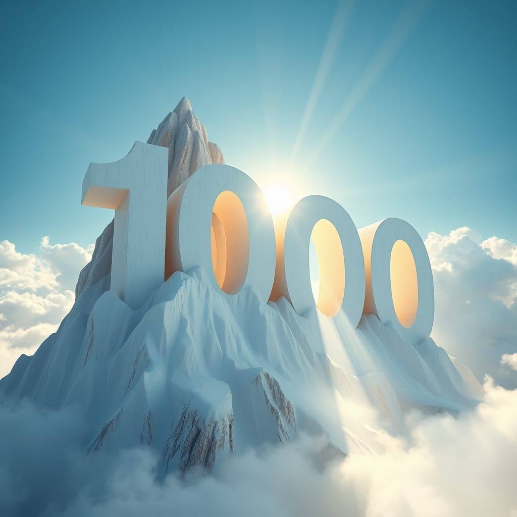 A breathtaking view of an alabaster mountain with the number 1000 carved into it. The scene is bathed in soft light and holy clouds, creating an ethereal and divine atmosphere.