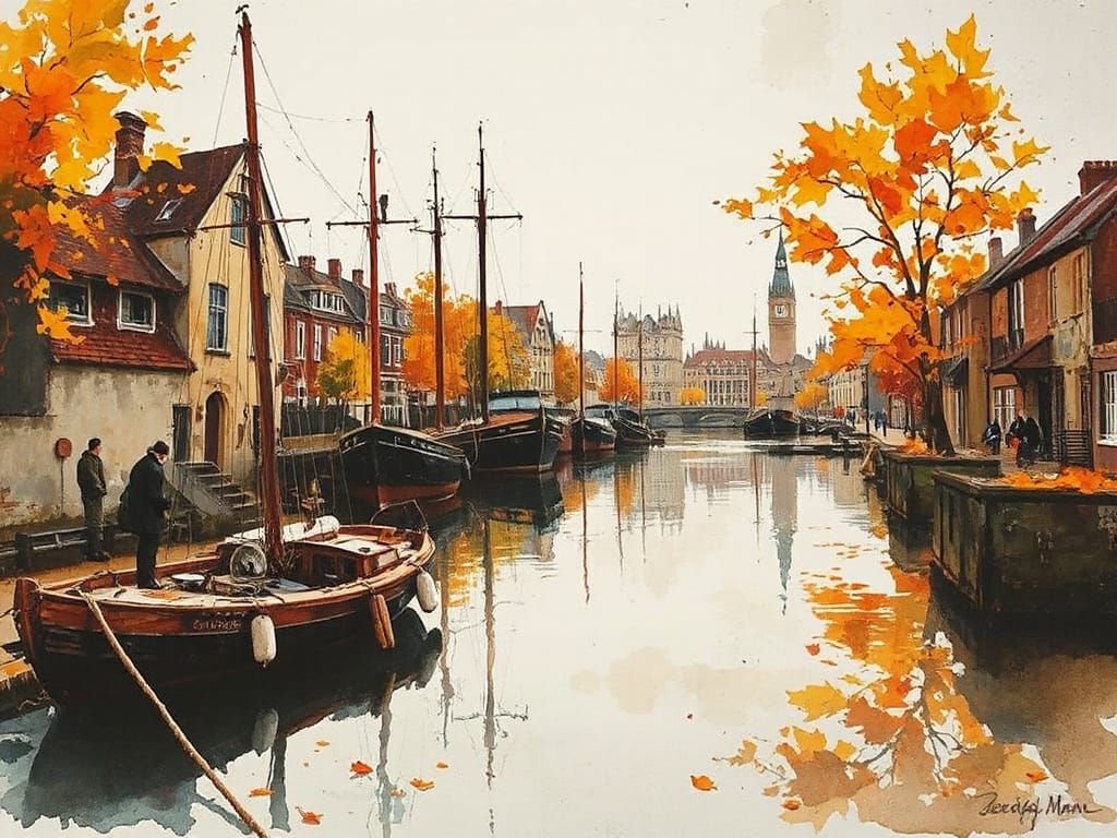 This image shows a haunting, watercolor depiction of an autumn harbor scene, with remnants of the past in muted, earthy tones, reminiscent of Van Gogh's post-impressionist style.