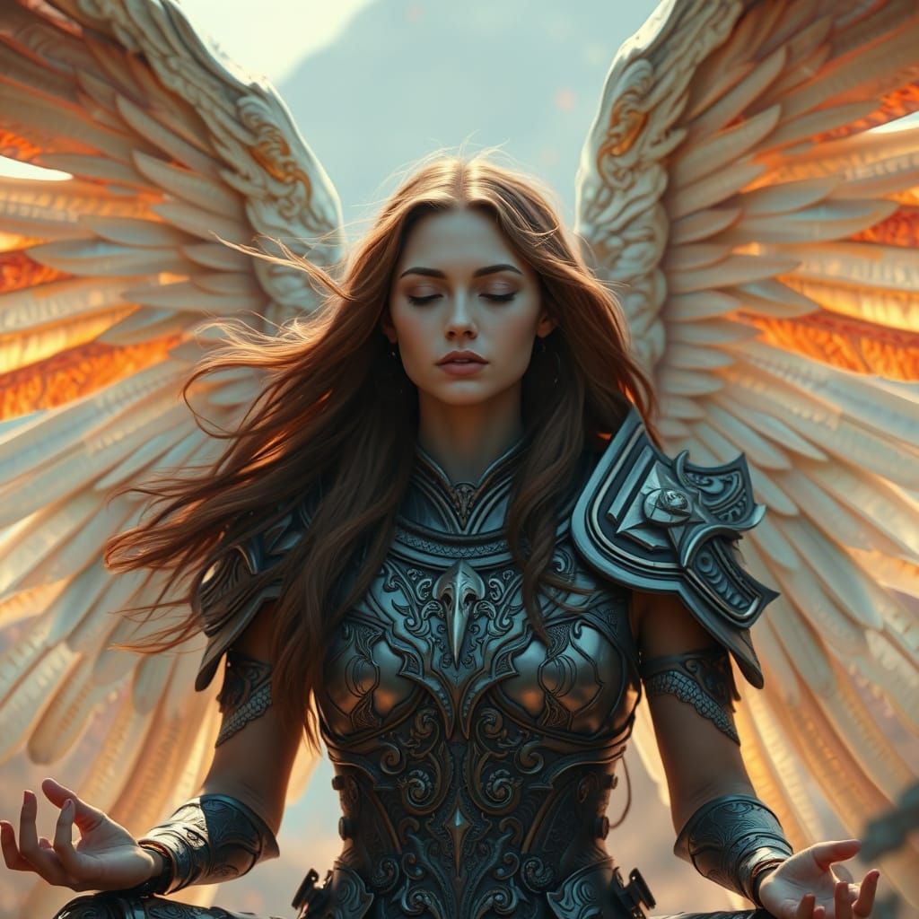 A striking picture of a female light warrior with brown hair and wings in serene meditation. This hyperrealistic digital painting features dramatic lighting and a vibrant background.