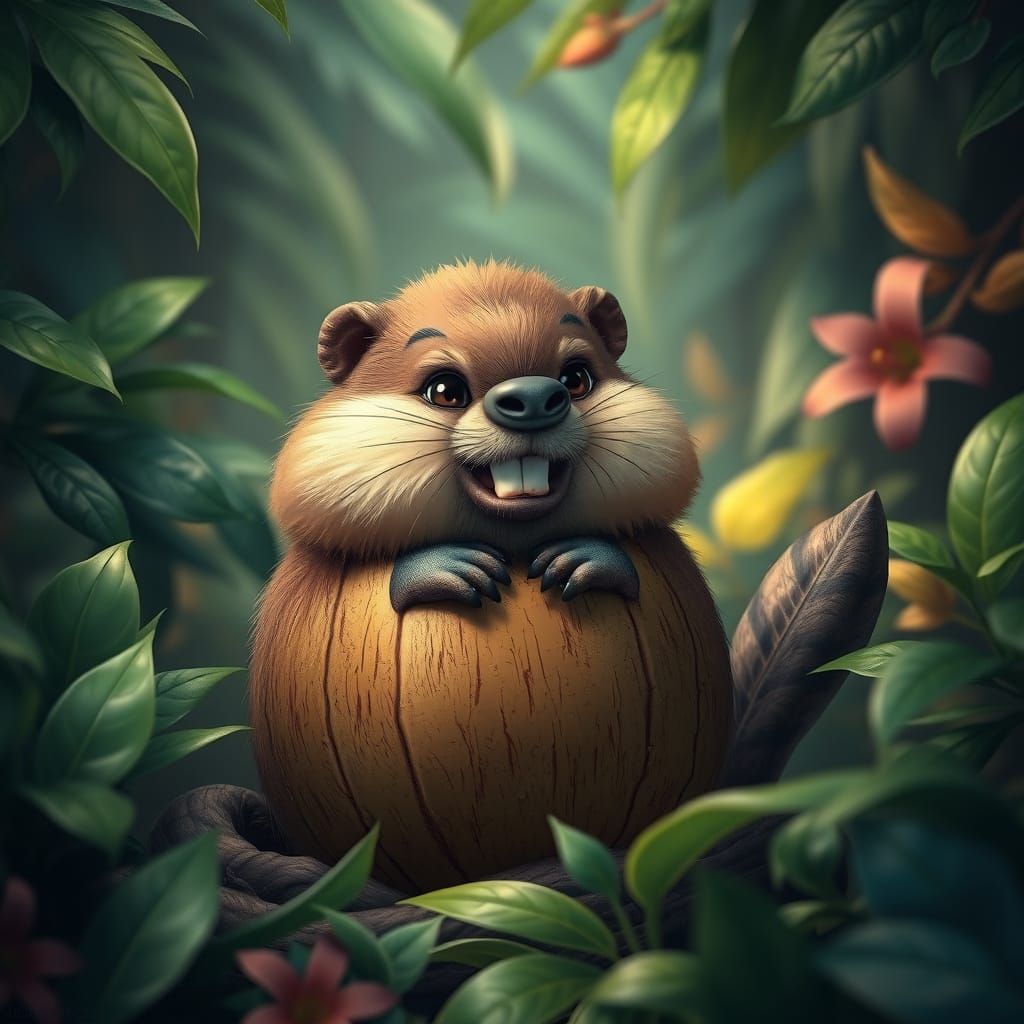 A vibrant image of a beaver with a coconut for a body, nestled in tropical foliage. The artwork features deep colors and intricate details, reminiscent of fantasy concept art.