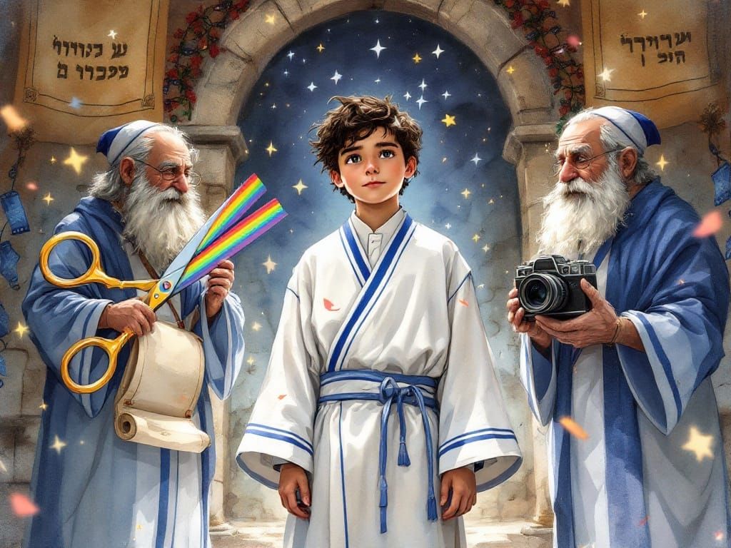 A watercolor portrait of a boy on the cusp of adulthood. He's flanked by elders with scissors and a camera, set against a backdrop of weathered stone and pixelated decorations in whimsical style.