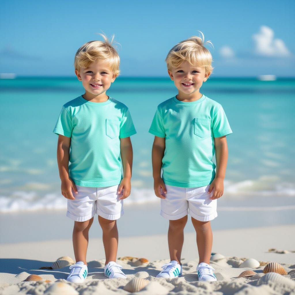 This image shows two young twin boys smiling on a sandy beach. They are wearing matching summer outfits and white sneakers. Soft, natural sunlight creates a realistic and lively atmosphere as 3D rendered digital art.