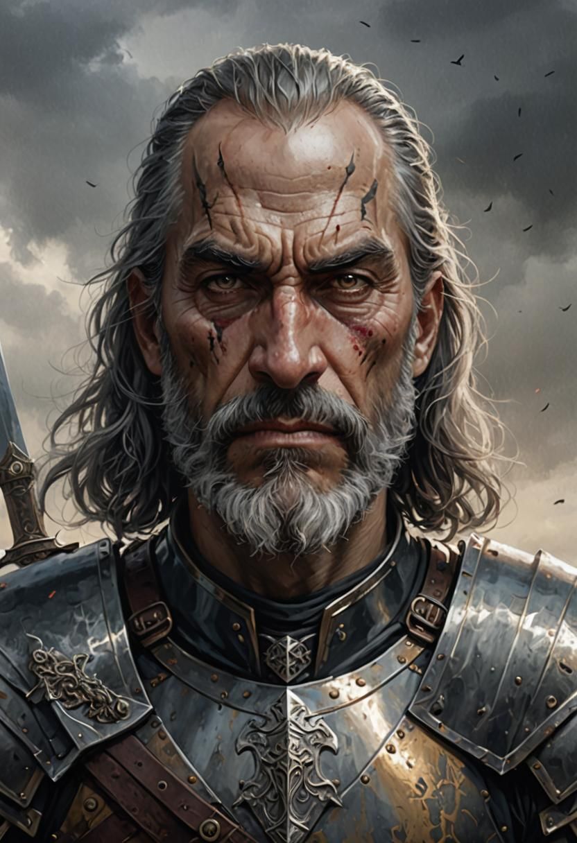 This image shows an older paladin in full plate armor, holding a sword and shield. The DnD-style illustration uses soft, earthen tones to evoke a gloomy, mysterious gothic fantasy atmosphere.