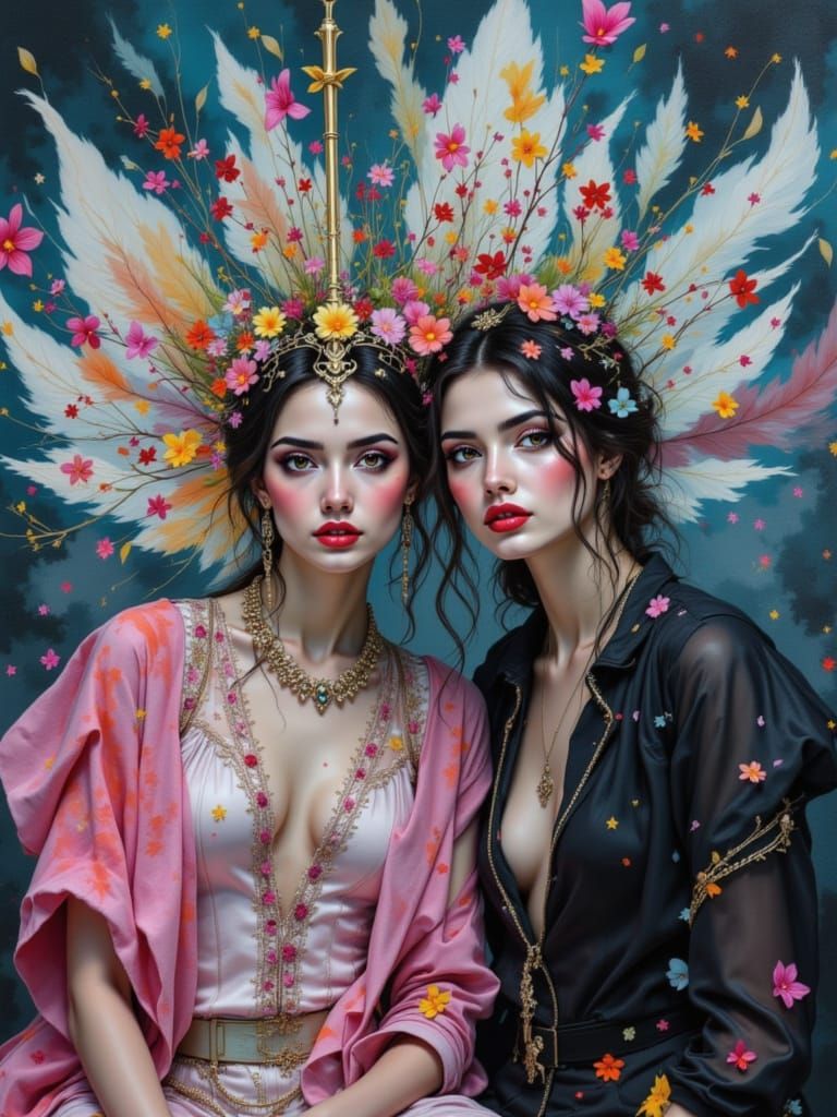This image depicts a winsome figure with a feathered crown. The artwork blends watercolor techniques with vibrant colors, reminiscent of both classic and modern artistic styles.