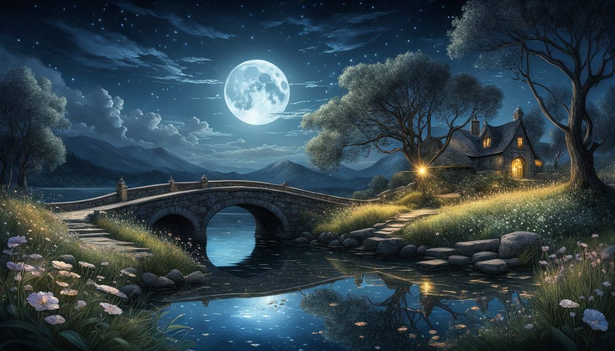 A watercolor painting of a floral meadow with a medieval stone bridge. Soft ink outlines and glowing pastel colors create an adorable storybook-style scene with river reflections as digital art.