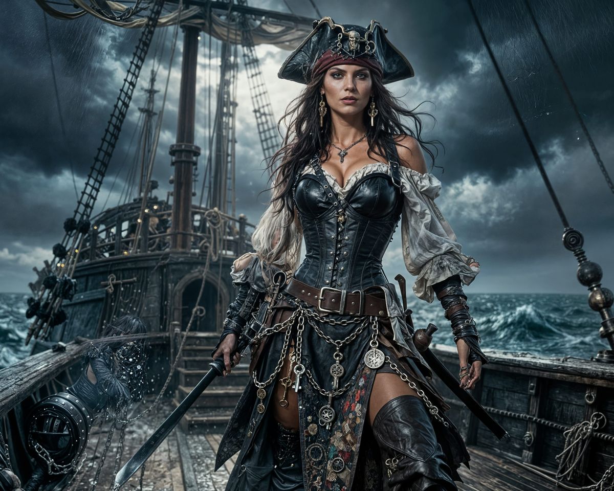 This image depicts a dark fantasy pirate raider woman. She wears a leather corset over a blouse and a unique patchwork skirt with chains and talismans.