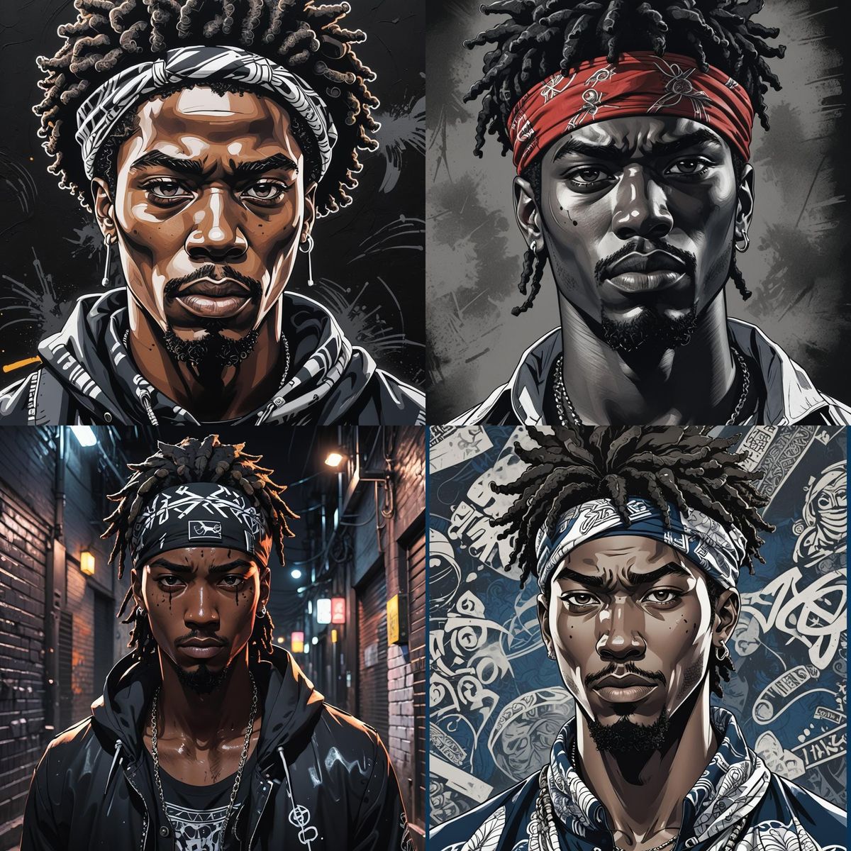 This image shows a Black man with twisted hair, dressed in gangster rap attire and wearing a black and white bandana. The image is cel-shaded with deep color, in a manga scan style.