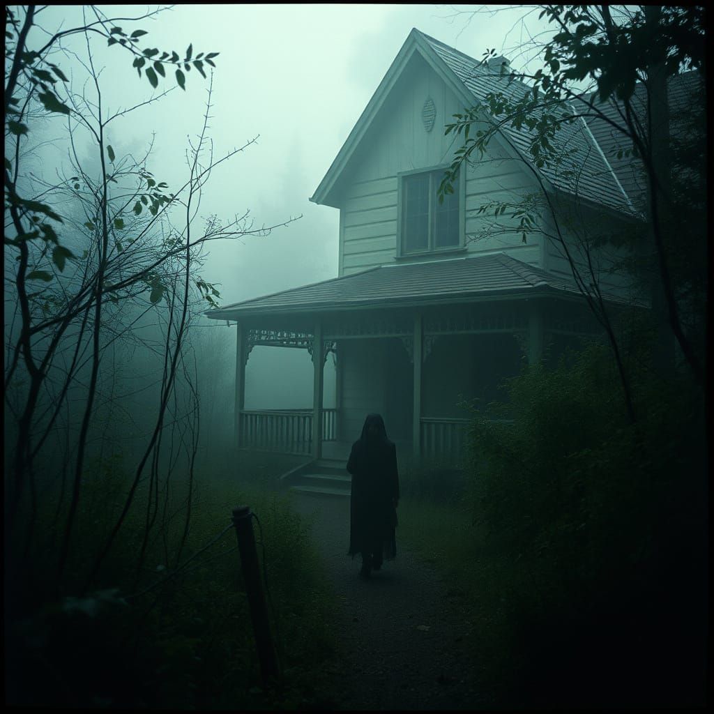 A hyperrealistic image showing ghosts of former residents wandering through the misty garden of an abandoned and dilapidated old mansion. The scene is cinematic with film grain and dramatic lighting.