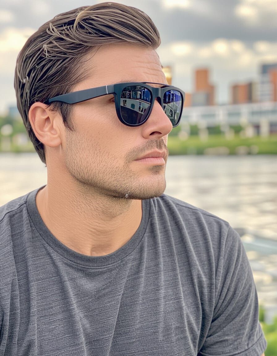 A cinematic portrait of a man in the rain with dramatic lighting. Raindrops glisten on his face and clothes. The image is ultra-realistic, reminiscent of film noir, and rendered in 8k.