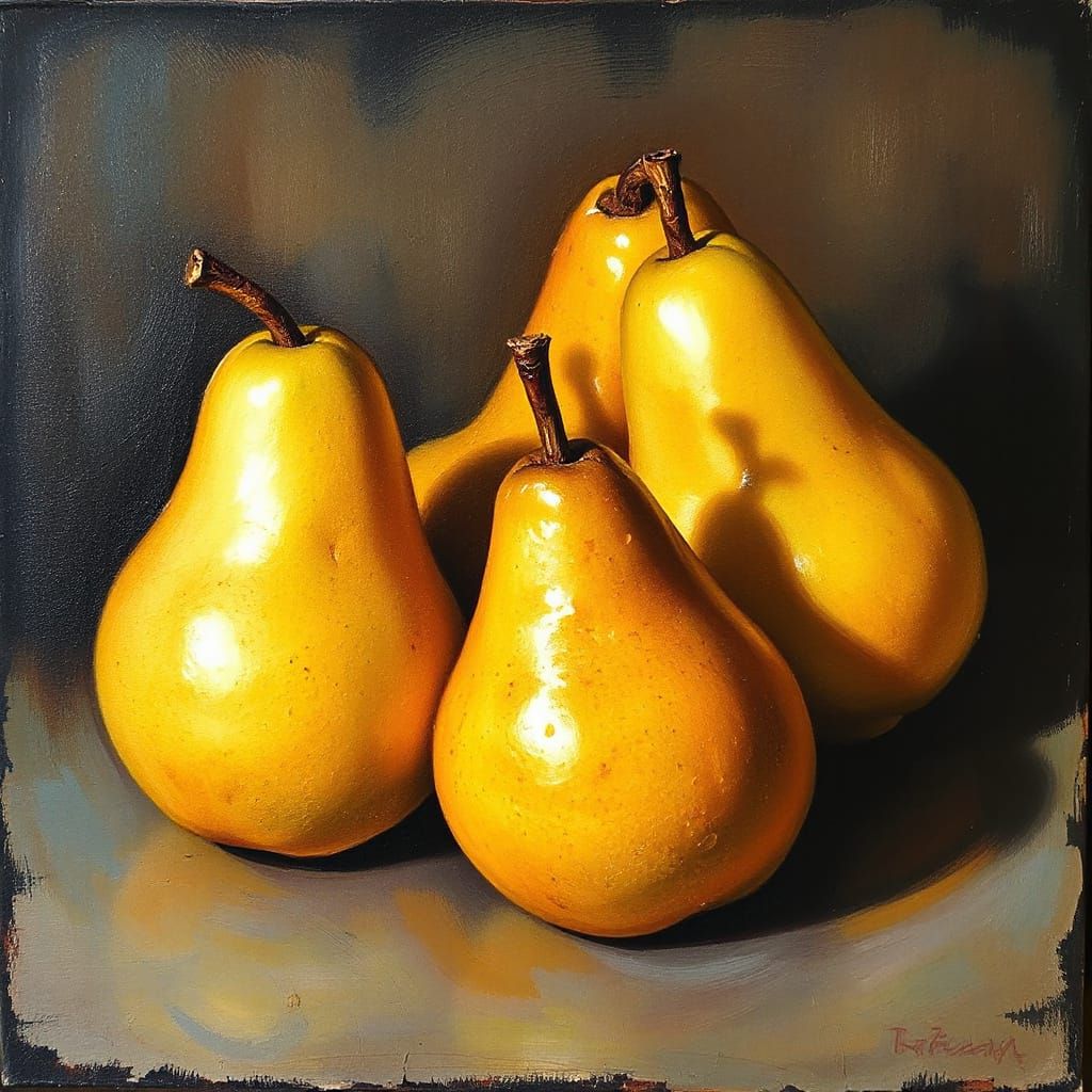 This image shows a still life of pears in vibrant colors. The artwork employs realistic rendering techniques with a subtle darkening effect around the edges of the composition.