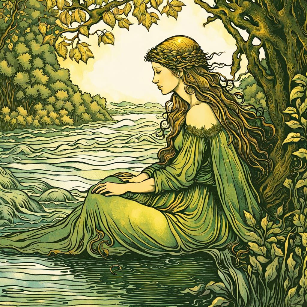 A close-up image of a naiad sitting by a river surrounded by lush foliage. The artwork features intricate woodcut details and soft watercolor textures, reminiscent of medieval art.