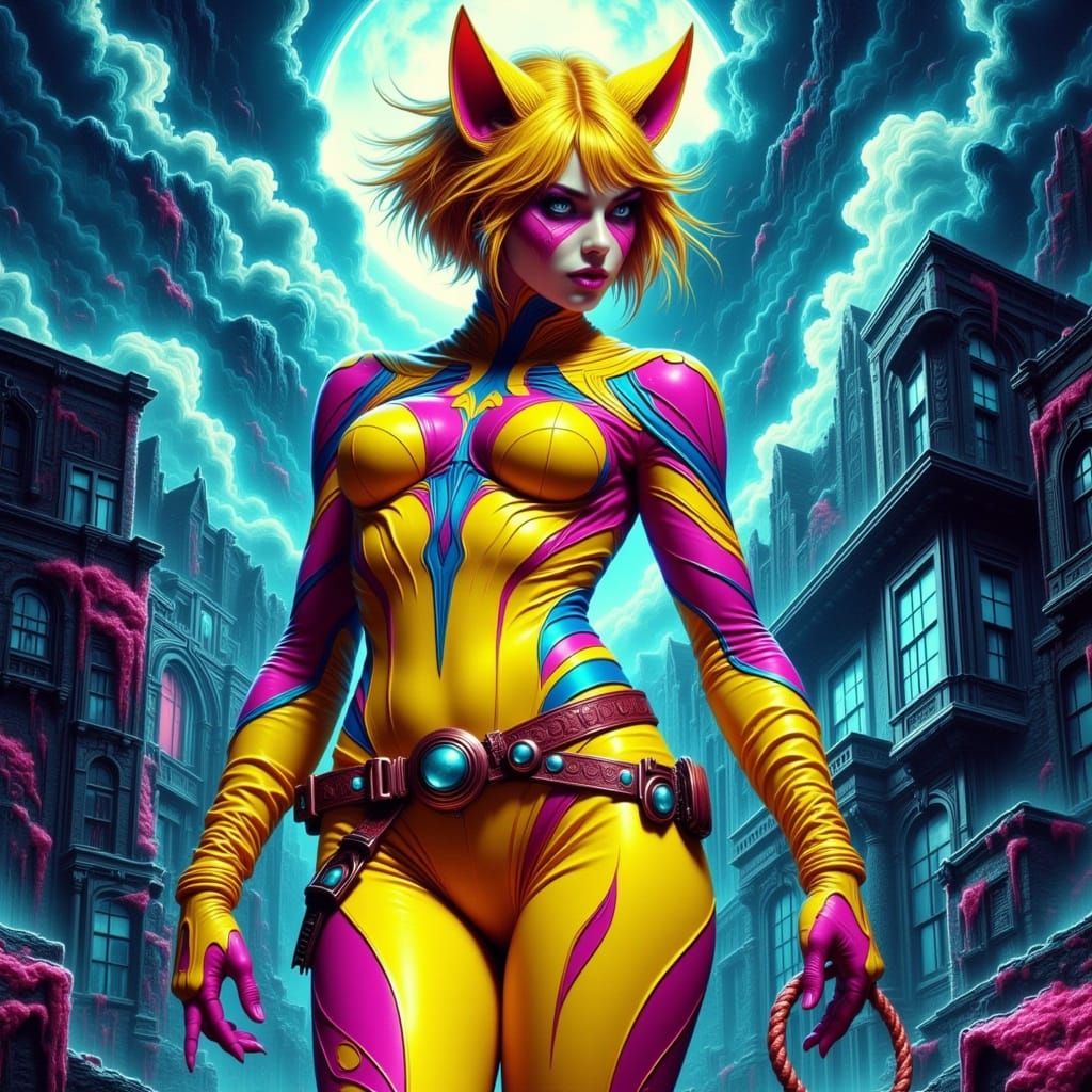 This striking image captures a dynamic heroine, Panthera, in a dramatic pose amidst a cityscape at dusk, with a bold, pulpy aesthetic and vibrant colors reminiscent of Jack Kirby and Bruce Timm's styles, with a textured, graphic quality inspired by Frank Quitely's illustrations.