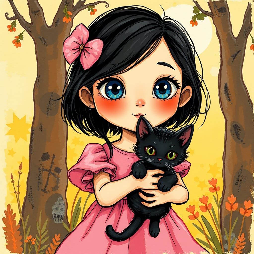 A charming image of a girl with dark hair and big blue eyes in a pink dress, holding a black cat. The artwork is vibrant and warm, with earthy tones and textured ink drawing.