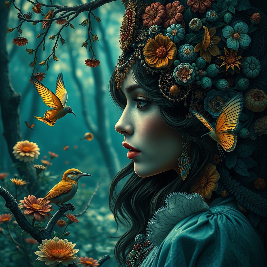 This image is a vibrant, hyperrealistic depiction of a mystical scene in a dreamlike forest landscape, where fantastical creatures and goddess-like figures interact amidst intricate botanical details and ornate patterns, set against a rich, dramatic background with deep, bold colors.