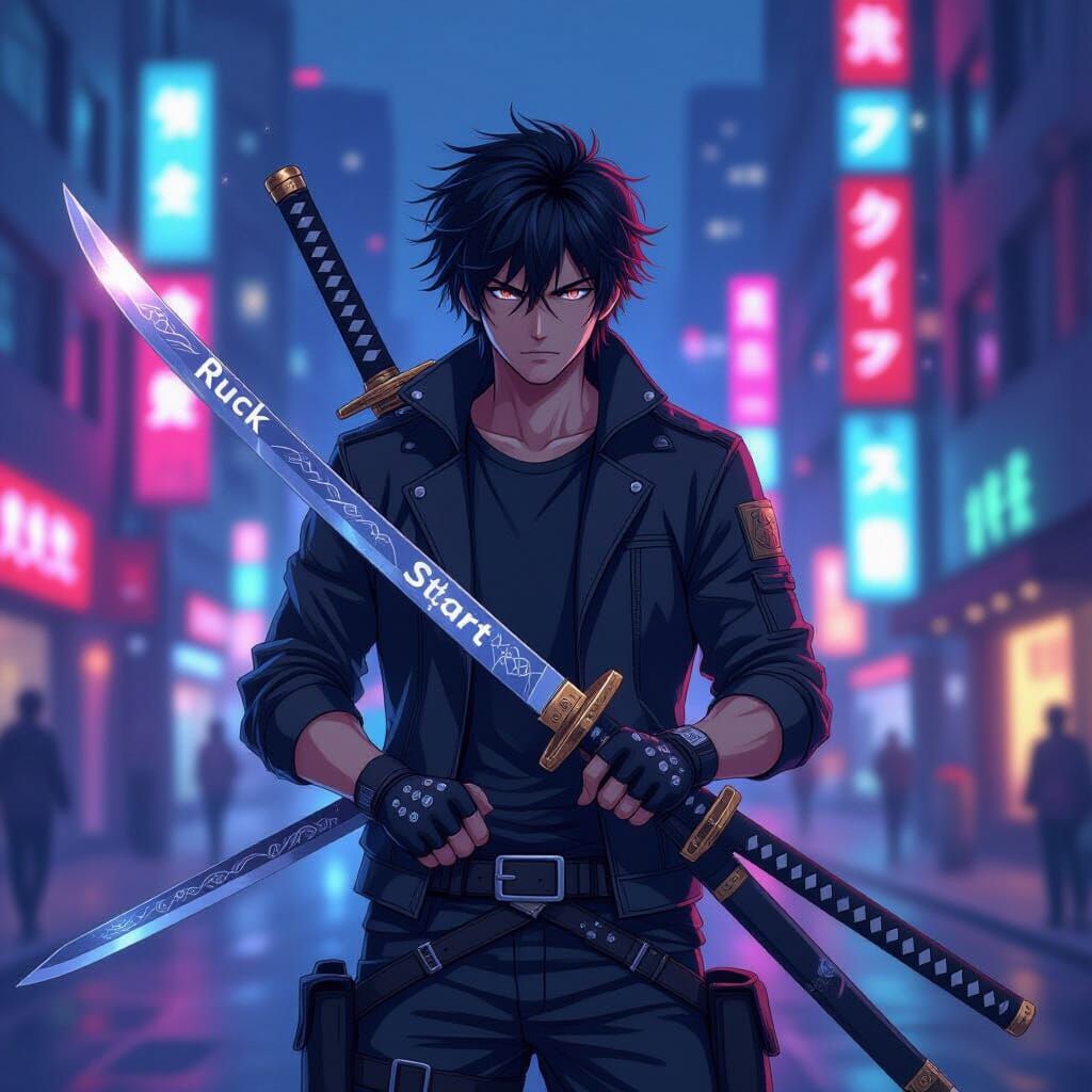A male anime character in an urban setting wields two intricately designed long swords against a vibrant cityscape aglow with neon lights. The image has a detailed anime aesthetic.