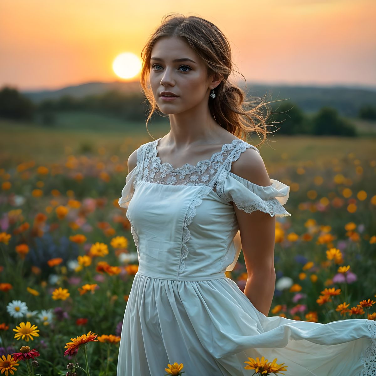 This image shows a woman in a white dress standing in a wildflower field, gazing at the horizon. The sunset casts a warm glow over this hyperrealistic scene with vibrant colors and intricate details.