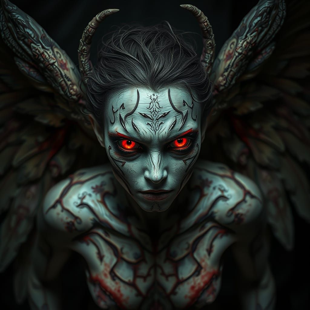 A striking picture of a monstrously beautiful fallen angel. This image captures a dark, cinematic scene with hyperrealistic detail, high contrast, and moody lighting, resembling digital artwork.