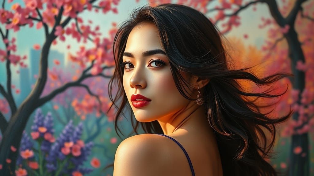 This serene portrait features a woman posing in a whimsical, natural setting, with a 2/3 face angle and vibrant, monochromatic hues of light bronze, teal, and dark purple, accented with gold leaf and subtle beige tones, on a textured canvas with intricate details and dramatic color depth.