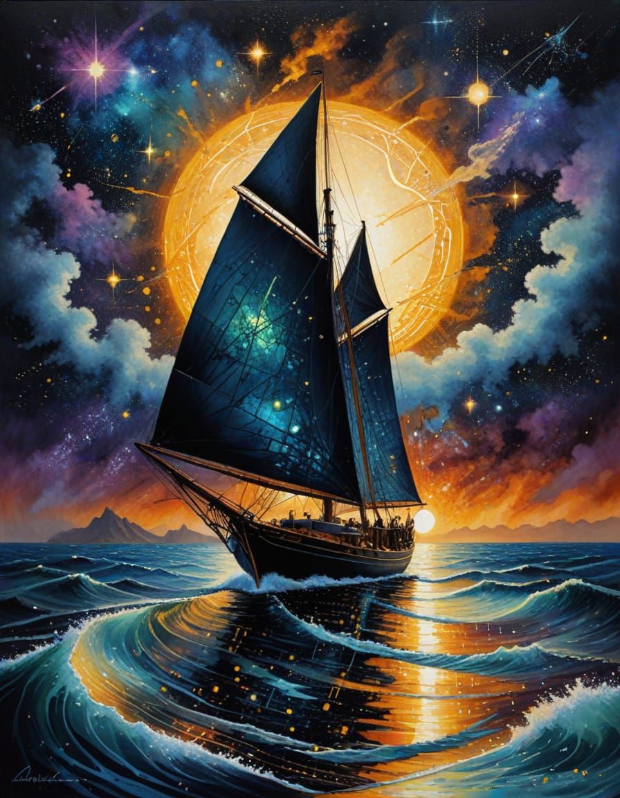 This image depicts a sailboat gliding across a breathtaking seascape of galaxies, nebulae, and constellations, its sails capturing cosmic winds with an iridescent aura. The mechanical surfaces are sleek and metallic, with intricate bioluminescent network designs and golden ethereal auras. The artwork is ...