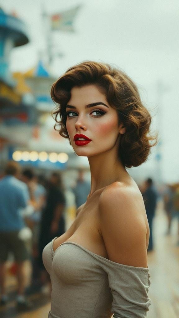 A digital painting of a 1950s pin-up woman posing on a boardwalk. The image uses atmospheric gradients and gestural figures to enhance the feeling of melancholy.