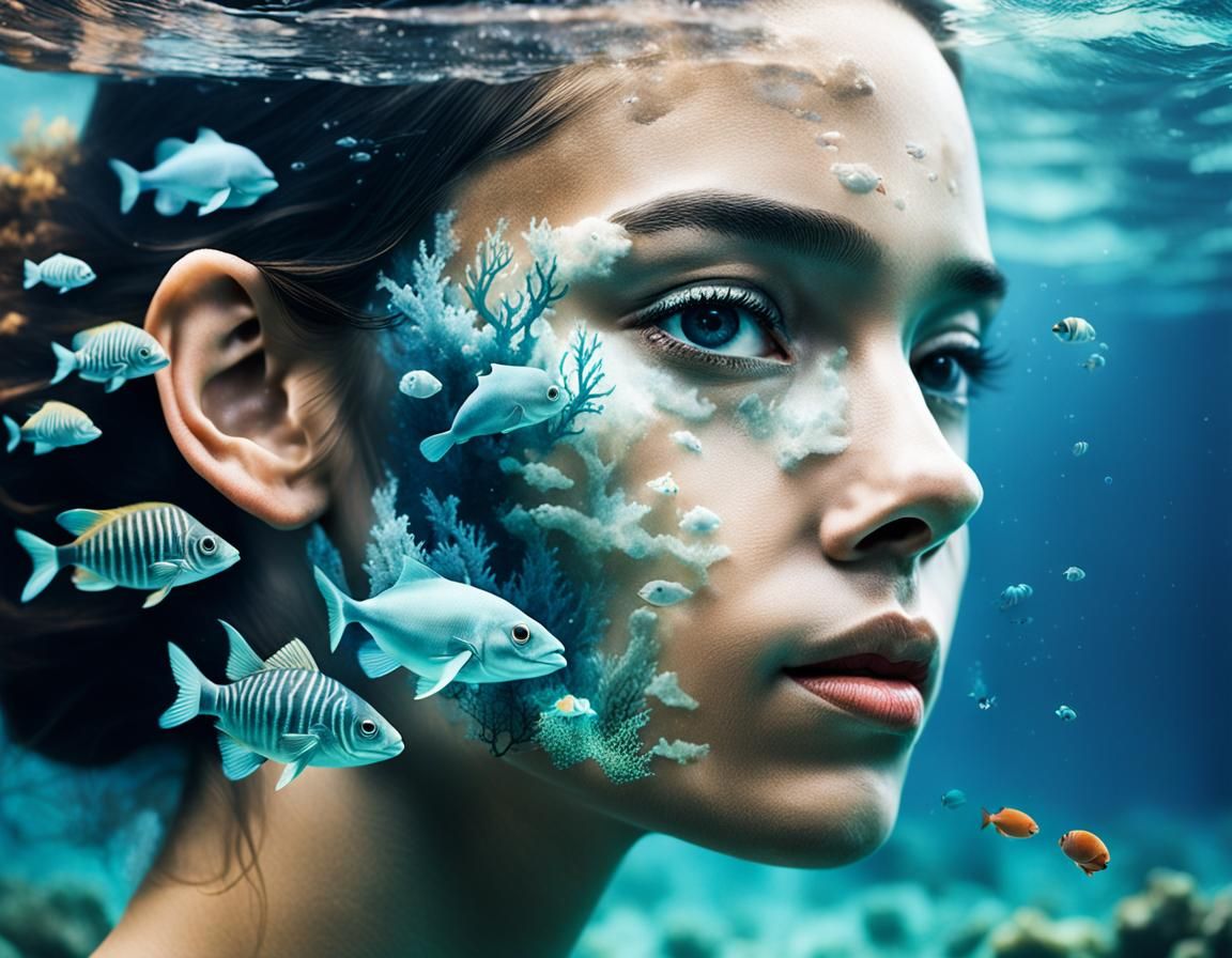 A surreal double exposure of a face merging into an underwater seascape. The portrait dissolves into coral and sea creatures, creating a dreamlike and seamless transformation.