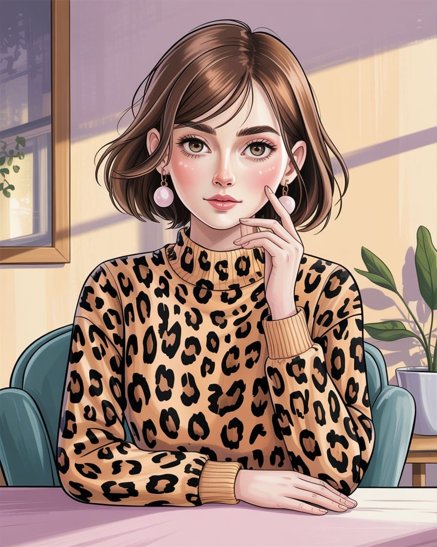 This image shows a young woman looking at the viewer. She is wearing a leopard print top with warm colors and soft lighting. The image is in a photorealistic anime style.