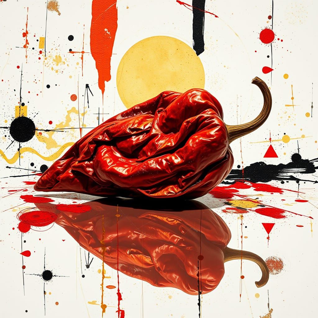 dried red pepper in style macro of geometric avant-garde style, ABSTRACT of geometric avant-garde style background painting surrealism fried sunny side contour gold up, big glare reflected in glare with on white ronde zen GOLDEN, assymetric background deformed reflection scratches ...