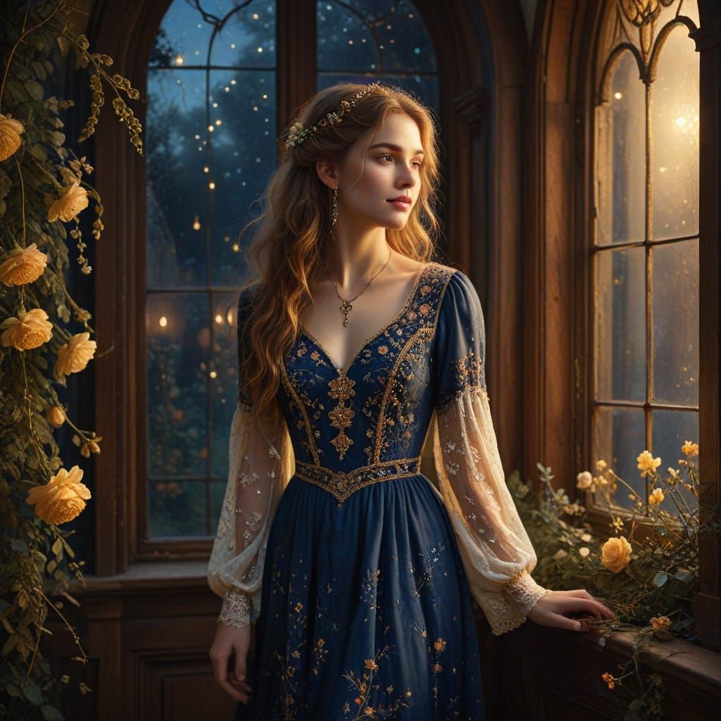 This image depicts a full body portrait of a young woman in a Victorian bohemian style, standing near an arched window. The painting features painterly textures and golden light, capturing a warm and enchanting atmosphere.